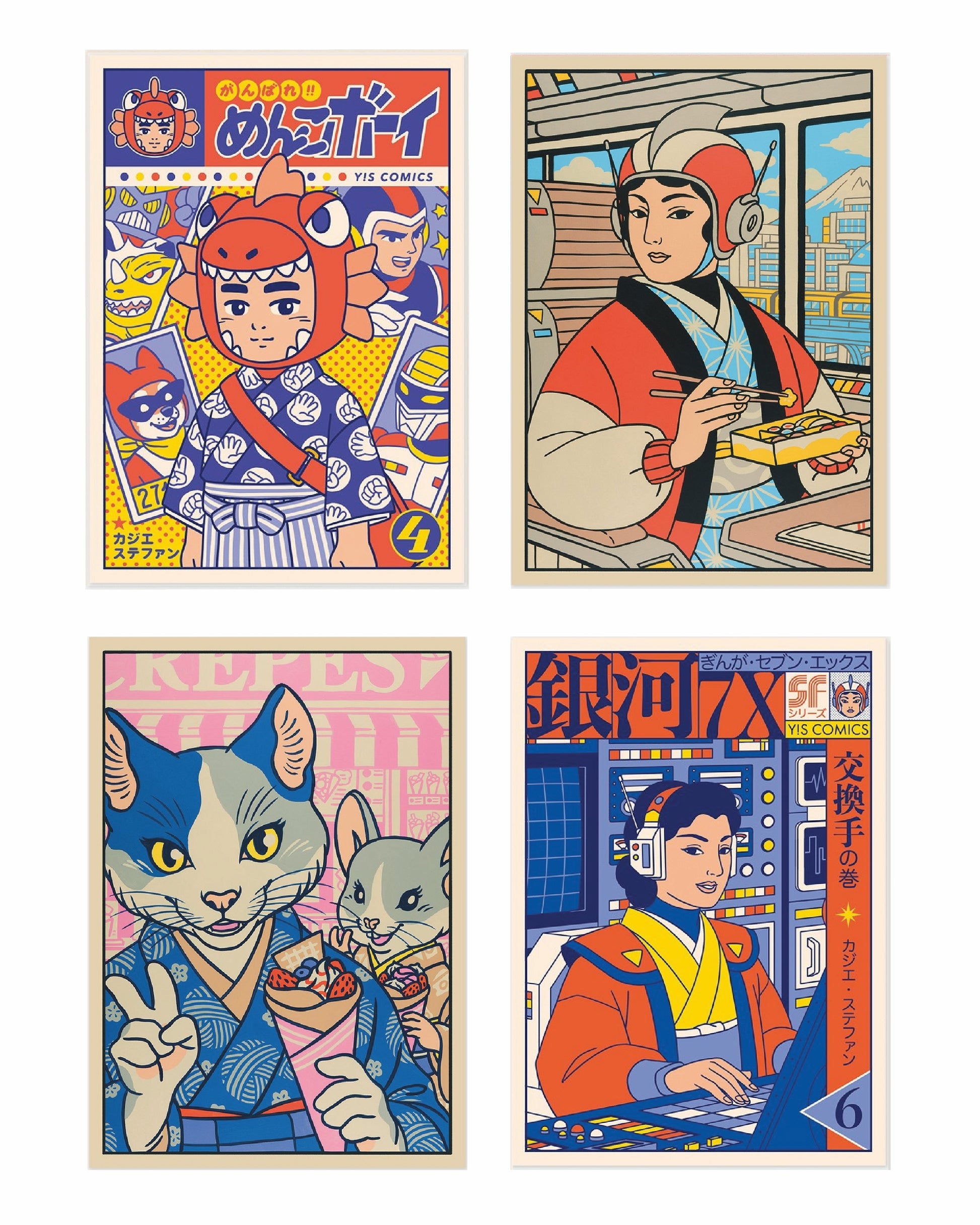 These postcards from yeaaah! studio combine whimsical imagery with nostalgic graphic style -artist Stéphan Casier studied in Japan and draws inspiration from the vibrant culture of anime. What a delight to receive in the letter box, brighten up your pin board, or why not frame a set that speaks to you?